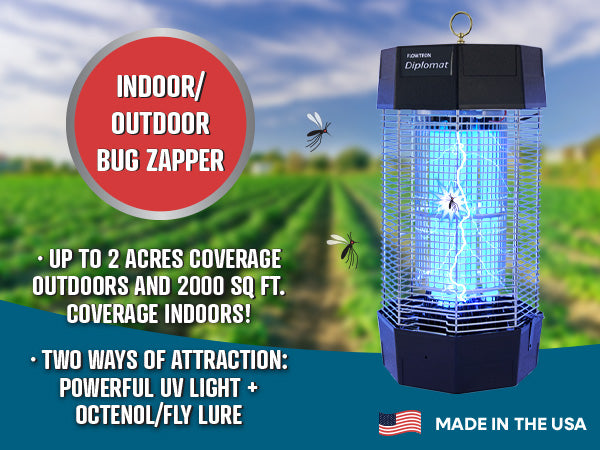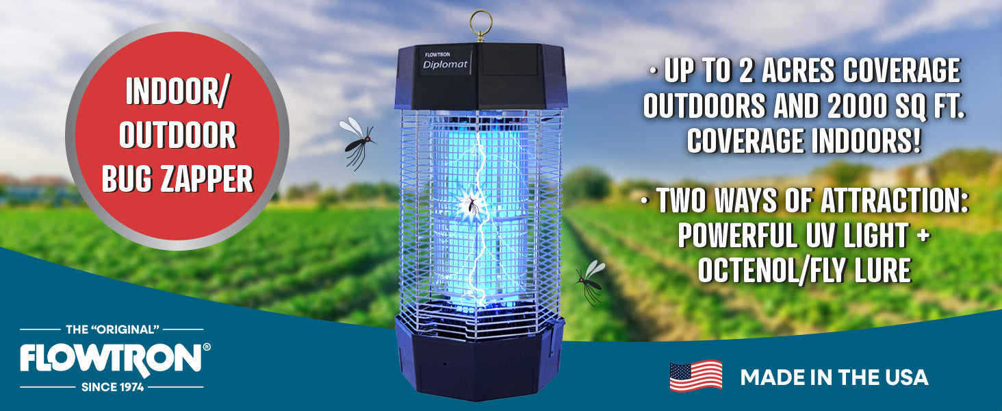 Say goodbye to pesky flies and biting mosquitoes with the Indoor/Outdoor Electric Bug Zapper from Flowtron! This supercharged insect eliminating system puts a powerful dual-action spin on the typical bug zapping lantern with its 2-in-1 UV light and fly sex lure/octenol attractant, anti-clogging grid, and high voltage transformer. Instead of inviting flies inside to collect, crackle, and burn, the powerful 5,600-volt shocker kills them upon contact, sending remains to the ground to be absorbed by the earth. Three 40-watt ultraviolet bulbs easily attract biting nuisances from near and far; and with the fly sex lure/octenol attractant cartridge, mosquitoes come flying from up to 2000 sq.ft / two acres away! This is because our design positions the fly sex lure / octenol cartridge close to the UV lamp, allowing the liquid to heat up, vaporize, and—in combination with CO2—mimic the breath, body odor, and musk of cattle, deer, sheep, moose, goats, oxen, yak, and other ruminants, which mosquitoes favor. Despite the unit’s shocking efficiency, it still blends seamlessly with your outdoor decor, requires minimal maintenance, and has been rigorously tested and UL certified to withstand the elements for many years of reliable and affordable pest control. For best results, hang approximately 25 feet from your outdoor living space and away from other light sources. Once ideally positioned, plug in and prepare for a better backyard experience!