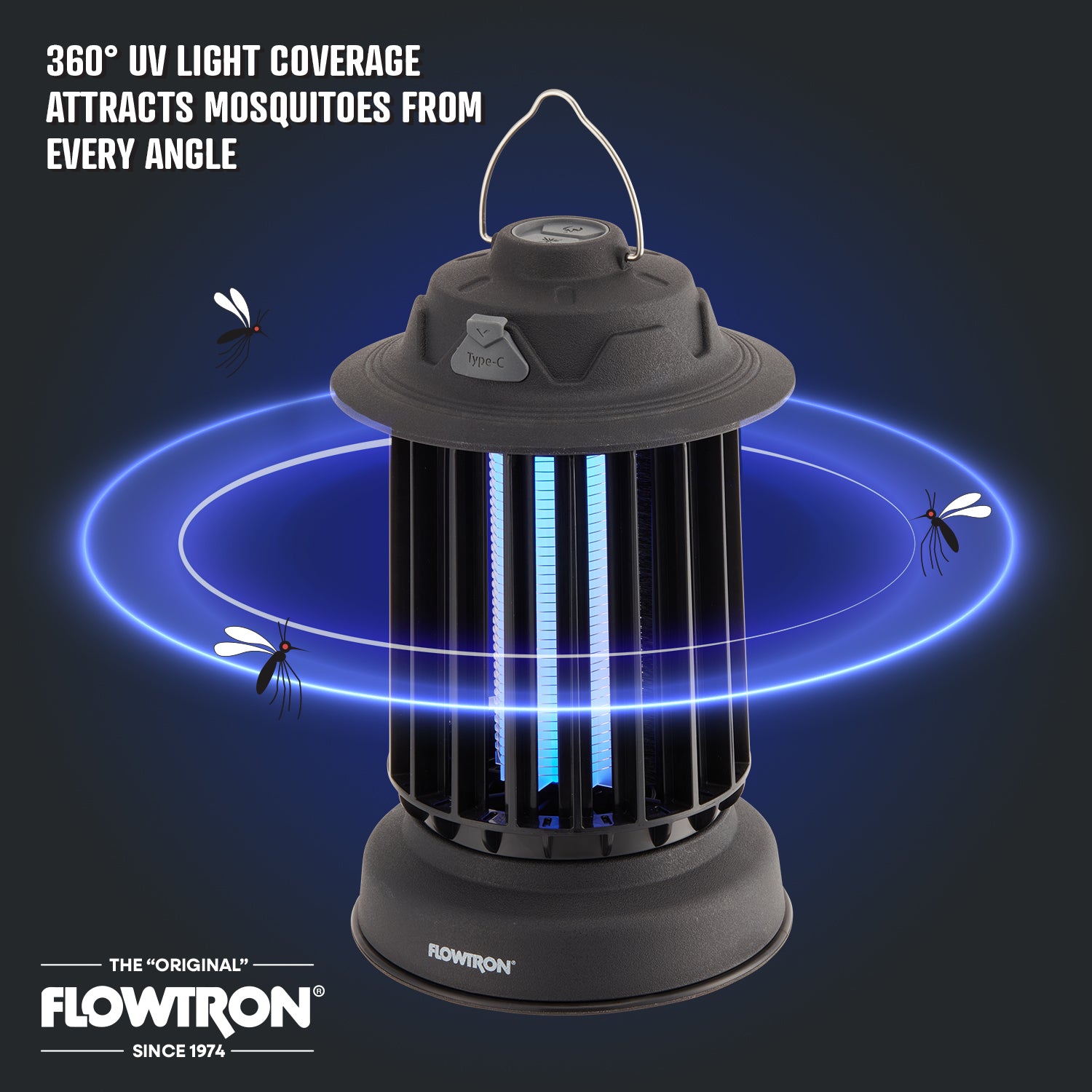 Transform your outdoor experience with the Flowtron Bug Zapper Lantern, the innovative 2-in-1 electric solution that eliminates flying insects while providing beautiful ambient lighting. Whether you're camping in the wilderness, hosting backyard gatherings, or enjoying quiet evenings on your deck, this versatile device delivers powerful electric bug control with the convenience of portable lighting. The scientifically designed UV LED uses optimal 360-400nm wavelength light to attract flies, gnats, and other flying pests directly to the high-voltage electric grid where they're instantly eliminated on contact. With impressive 2150 square feet of coverage, this electric zapper protects large outdoor areas effectively and immediately. The high-capacity 2000mAh lithium-ion battery ensures reliable performance with up to 24 hours of lantern operation or 16 hours of continuous bug zapping on a single charge, while USB-C charging provides convenient power-up from any source. Three distinct operating modes offer complete versatility: high and low intensity zap modes for customized insect control, steady orange LED lantern mode for practical lighting, and atmospheric flickering flame effect that creates beautiful campfire ambiance without smoke, sparks, or fire dangers. The revolutionary self-cleaning feature sets this zapper apart with an automated internal brush system that circles the electric grid every 24 hours of operation, removing dead insects and debris to maintain peak zapping performance - or activate manually anytime for instant cleaning. At just 1.28 pounds with a compact 6.5-inch diameter, it's incredibly portable yet powerful enough to handle serious insect problems in camping sites, patios, gardens, and outdoor dining areas. The protective outer grill ensures safety around children and pets while allowing insects to reach the electric grid, and the audible zap provides satisfying confirmation of each elimination. Unlike chemical sprays or messy traps, this electric zapper provides immediate, chemical-free pest control that you can see and hear working. The durable construction withstands outdoor conditions while the elegant design complements any outdoor setting, from rustic campsites to sophisticated patio furniture. Whether you need serious mosquito control for tropical camping or ambient lighting with pest protection for backyard entertaining, this professional-grade electric zapper lantern delivers reliable results backed by Flowtron's trusted 1-year limited warranty.