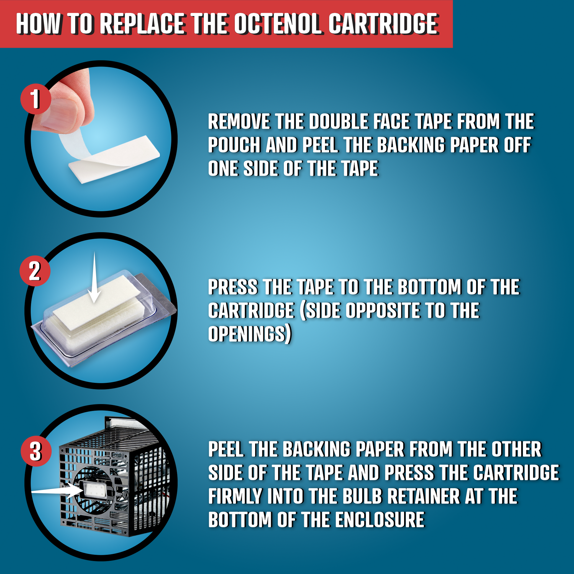 The Flowtron Octenol Mosquito Attractant partners with the Outdoor Bug Zapper series of Flowtron Products. Our patented design positions the octenol cartridge close to the UV lamp, allowing the liquid to heat up, vaporize, and—in combination with CO2—mimic the breath, body odor, and musk of cattle, deer, sheep, moose, goats, oxen, yak, and other ruminants, which mosquitoes favor. Using the Octenol Mosquito Attractant helps increase the effectiveness of Bug Zappers in killing certain mosquitoes and biting flies. Each slow-release cartridge contains 1660 mg of octenol mosquito attractant and lasts for up to 450 hours.